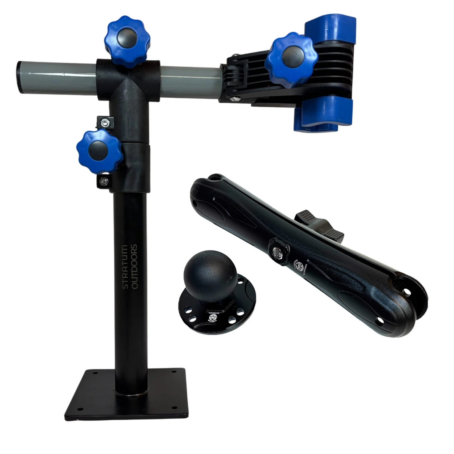 Experience enhanced stability and smooth operation with Stratum’s Patent Pending ThruBolt technology (U.S. Application 19/391,796). This innovative design features two bolts that pass through the mount and rest in the grooves within the pole collar. The bolts ride horizontally inside the grooves which securely lock your mount in place. The dual-bolt system distributes pressure evenly, reducing stress on the collar and pole while allowing for precise and effortless 360-degree rotation. With ThruBolt Technology, your mount stays firmly in position, even in challenging conditions, ensuring consistent and accurate performance on the water. A thumb screw is incorporated in each mount to allow the user to lock the mount in place to prevent any unwanted rotation so that you can focus on your catch.